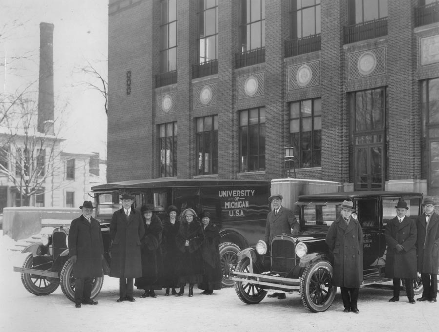 Kelsey and others outside the U-M Library with expedition vehicles donated by Mr. Bloomer and Graham Bros. Kelsey Museum Archives