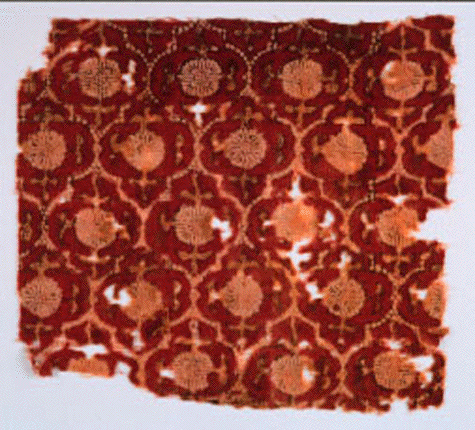 MEDALLIONS AND TREFOILS Stamped and painted mordants, dyed red and brown, (?) green applied Overall repeating pattern of adjacent medallions, each with a rosette at the center Cotton 34.7cm x 31.4cm Acc.No. 94122