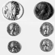 | Bronze military diplomas such as the one at right, which was found in Egypt, were given to veterans of the Roman Army upon their discharge. | The coins above all show the heads of women rulers or wives of rulers. |