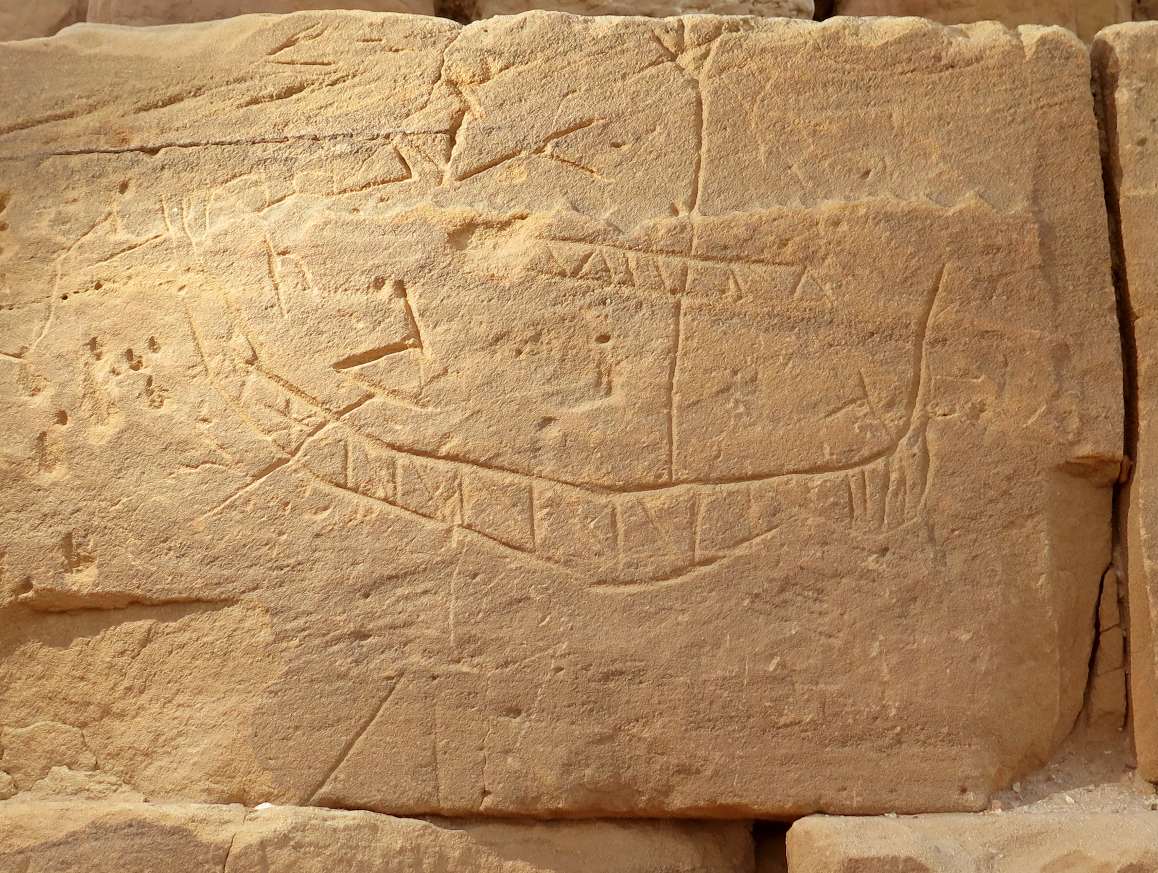 Wear above and on the left side of this block has made this otherwise rather boldly incised type 2 vessel somewhat difficult to see. The curved hull is higher at the stern than the bow, which is marked by a rounded structure below curves up and tapers sharply to a point. The hull is broadest amidships, narrowing toward the stern as it curves upward and then angles sharply inward after almost disappearing in a worn area. Above the hull, the stern angles forward sharply and ends in some angled lines that may represent a structure of the sort found on graffiti P6 and P7. The stern and hull are marked by a series of transverse and angled lines that appear like bindings, something unlikely on this kind of river craft.