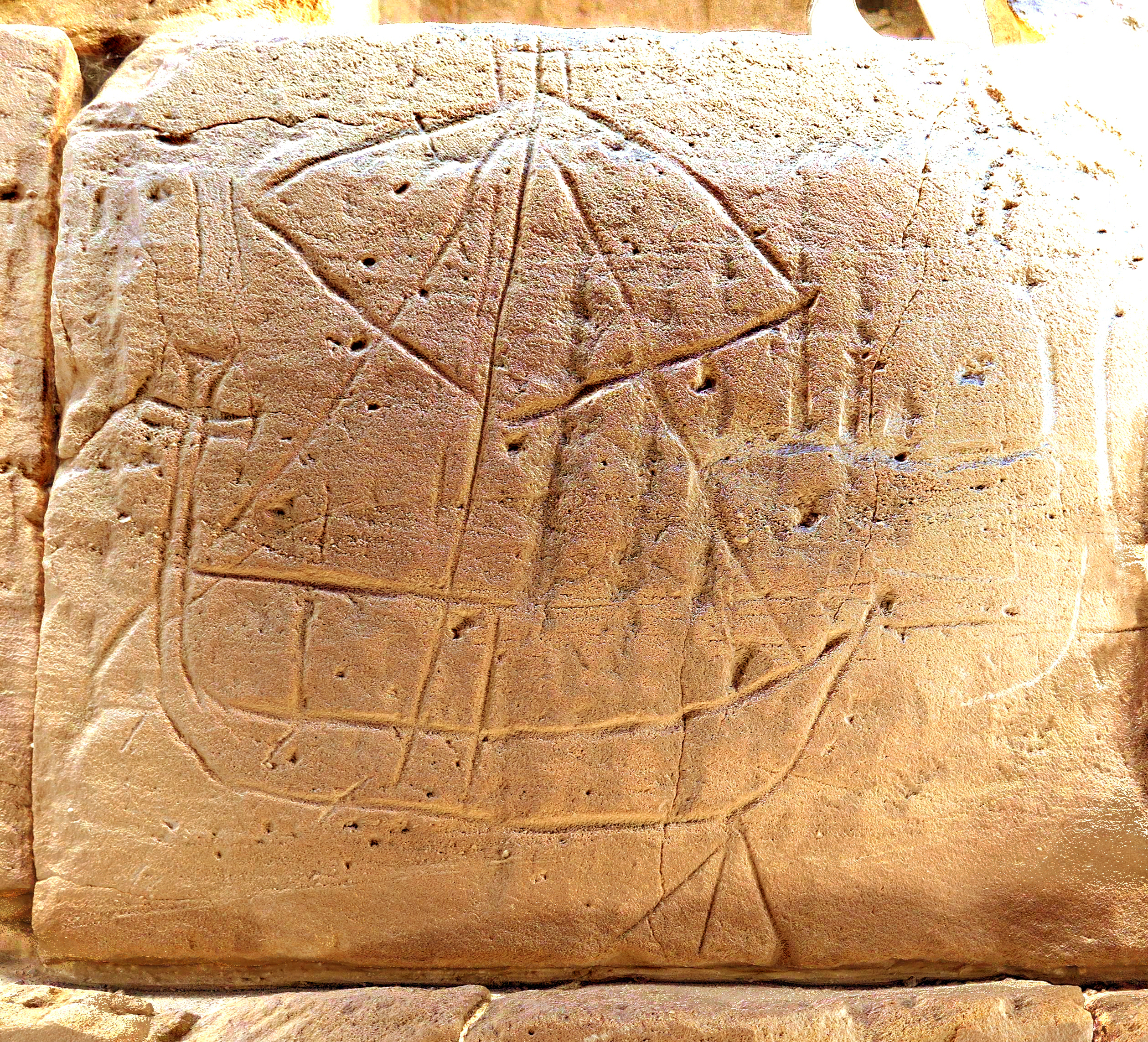 This boat fills the left half of the block and a little more. The low, pointed prow expands to a rather thick hull that narrows and curves sharply but smoothly to form the stern. The stern is high and narrow and terminates in a cruciform tip with arms splayed as the cross pattée. The triangular rudder is shown as though attached to the stern by its long side. On the deck a rectangular structure extends from the stern to forward of the mast, which stands within it. At the top of the mast is a small, nearly rectangular structure, below which four lines descend: two extend to the tips of a broad V-shaped yard, and two support a lower yard extending from bow to stern. The mast is shown extending to the bottom of the hull.