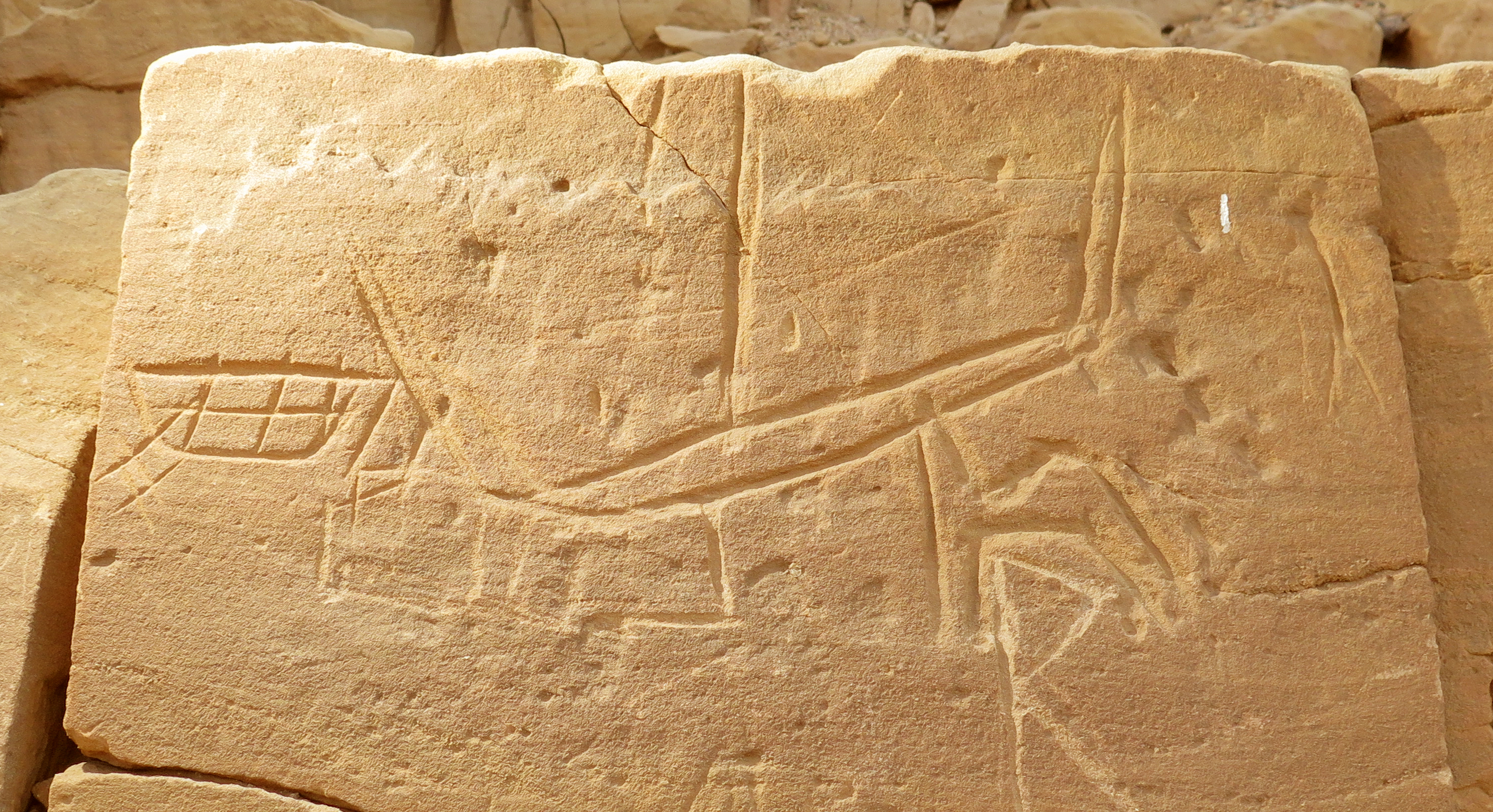 After graffito P11 was cut, a very simplified camel was carved with the head intersecting the hull. The neck and forelegs are straight, while the hind legs curve to the belly and hump.