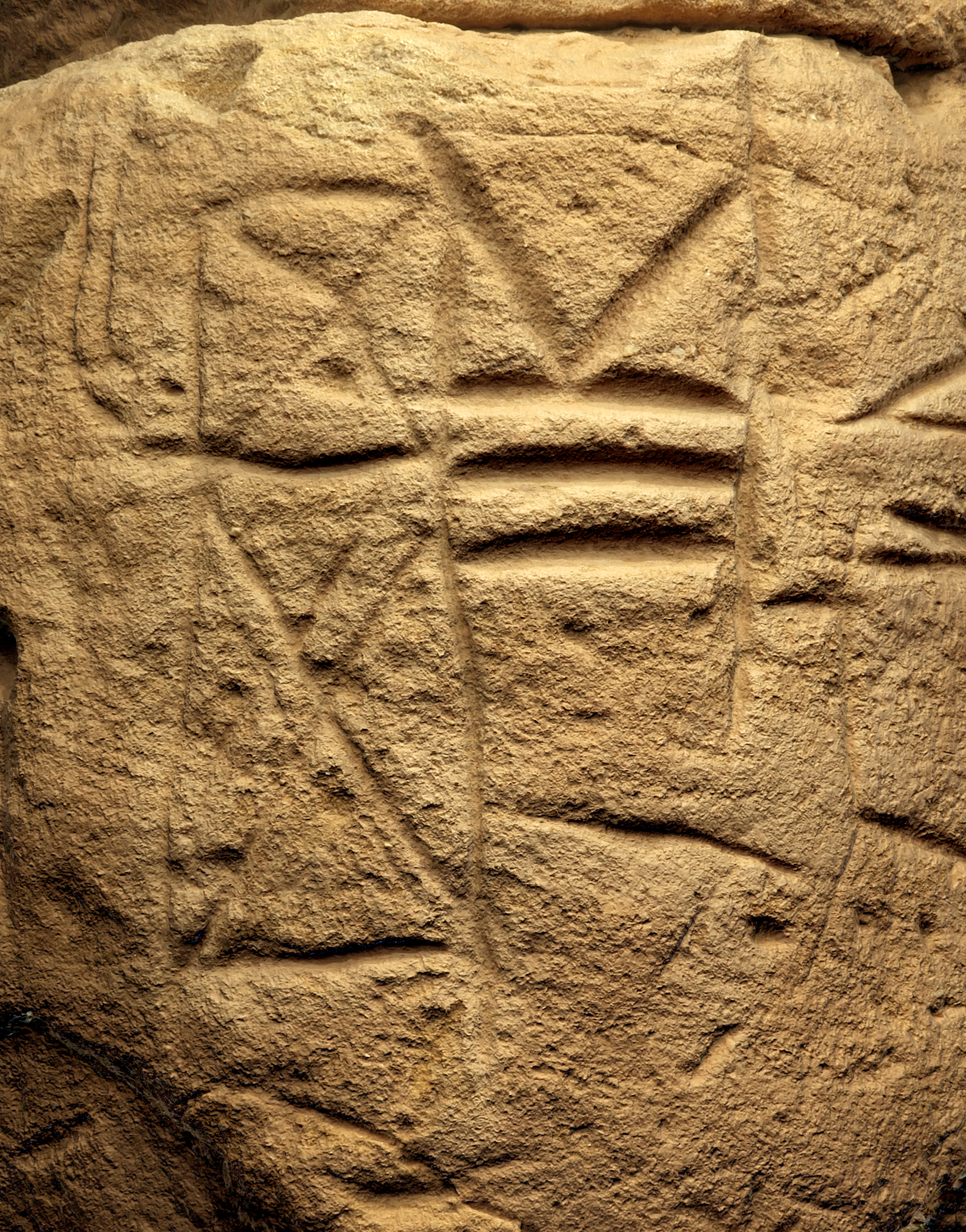 To the left, a blocky design of stacked Xs in boxes appears to have a curved arm, suggesting that this might represent a human figure. It is shown next to a horned altar (graffito T27) and seems to be part of a scene that includes a third geometric graffito to the right (graffito T49).