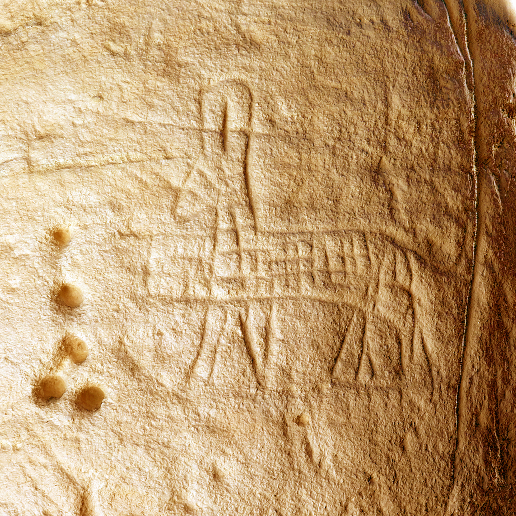 The body of this ram is decorated with hatch marks, probably meant to indicate fleece. The forelegs are outlined and the back legs indicated with multiple vertical lines. The chest extends past the head; the lines here are fainter and may indicate a proportional mistake by the carver, which was “fixed” by carving the rest of the body more deeply once the head was added. Alternatively, this extended area of carving could be meant to indicate an object in proximity to the ram.