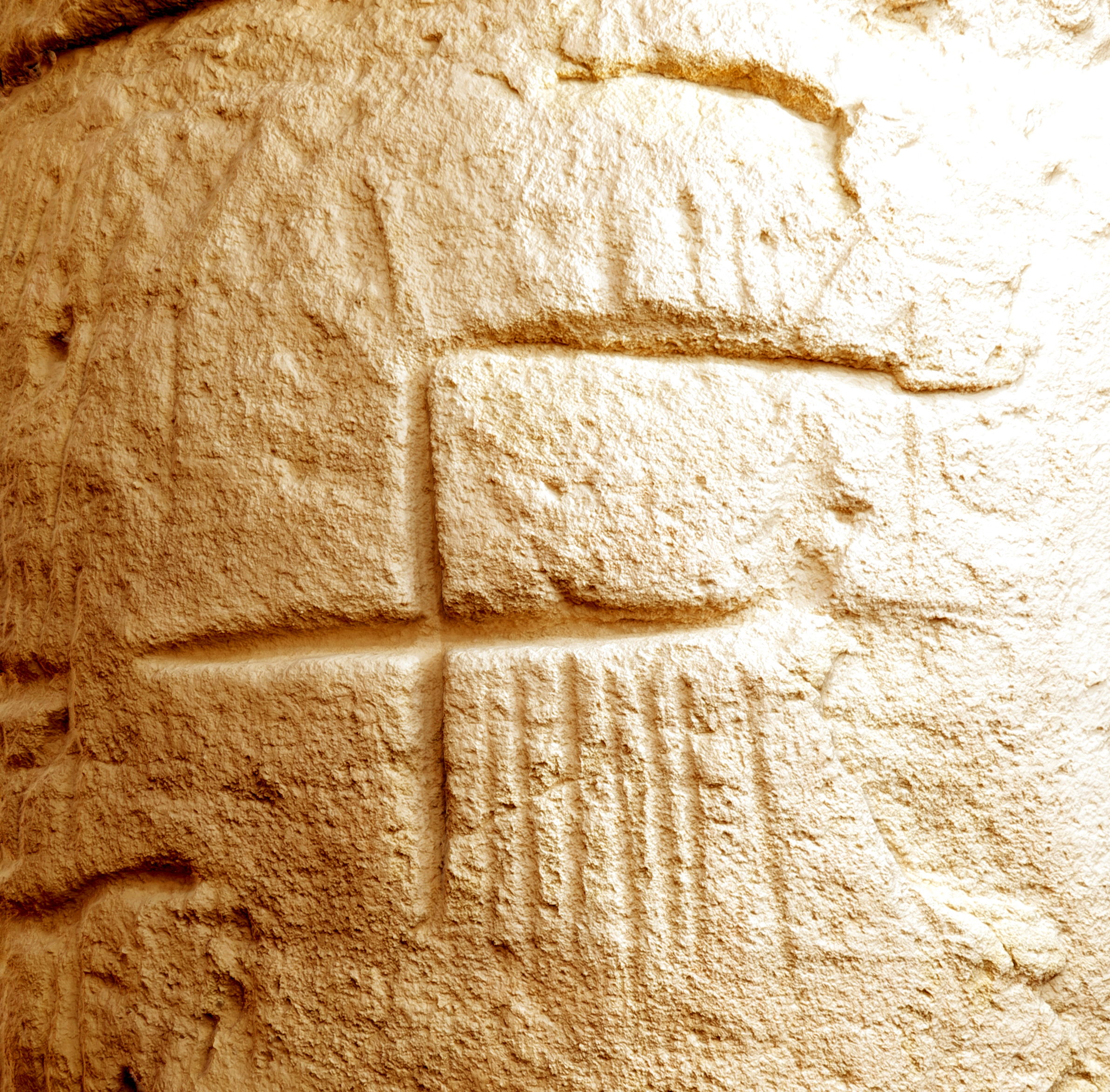 Located on the same column as the two previous entries (graffiti T37 and T38), this shows an example of a far less elaborate textile. Although the center is a plain, unpatterned square, fringes are indicated at the top and bottom edges. The deeply incised cross at the lower left of the textile design appears to be a later addition.