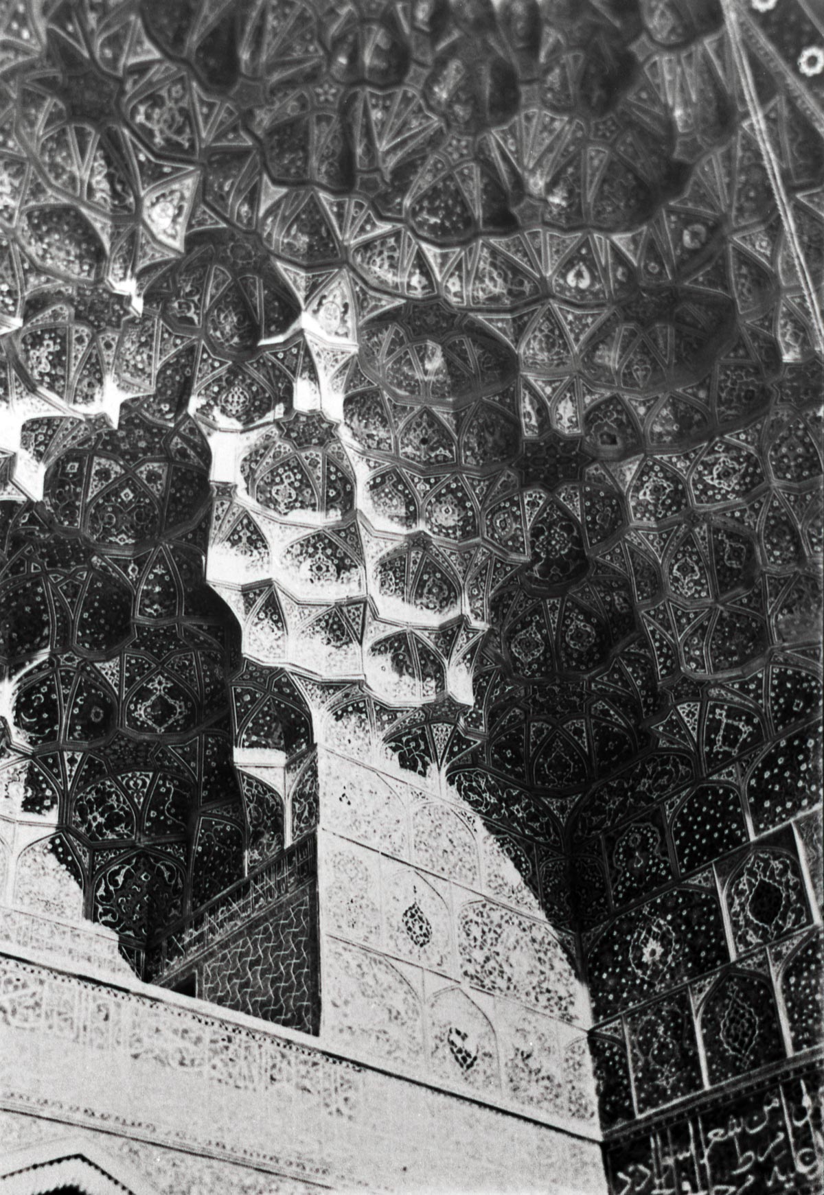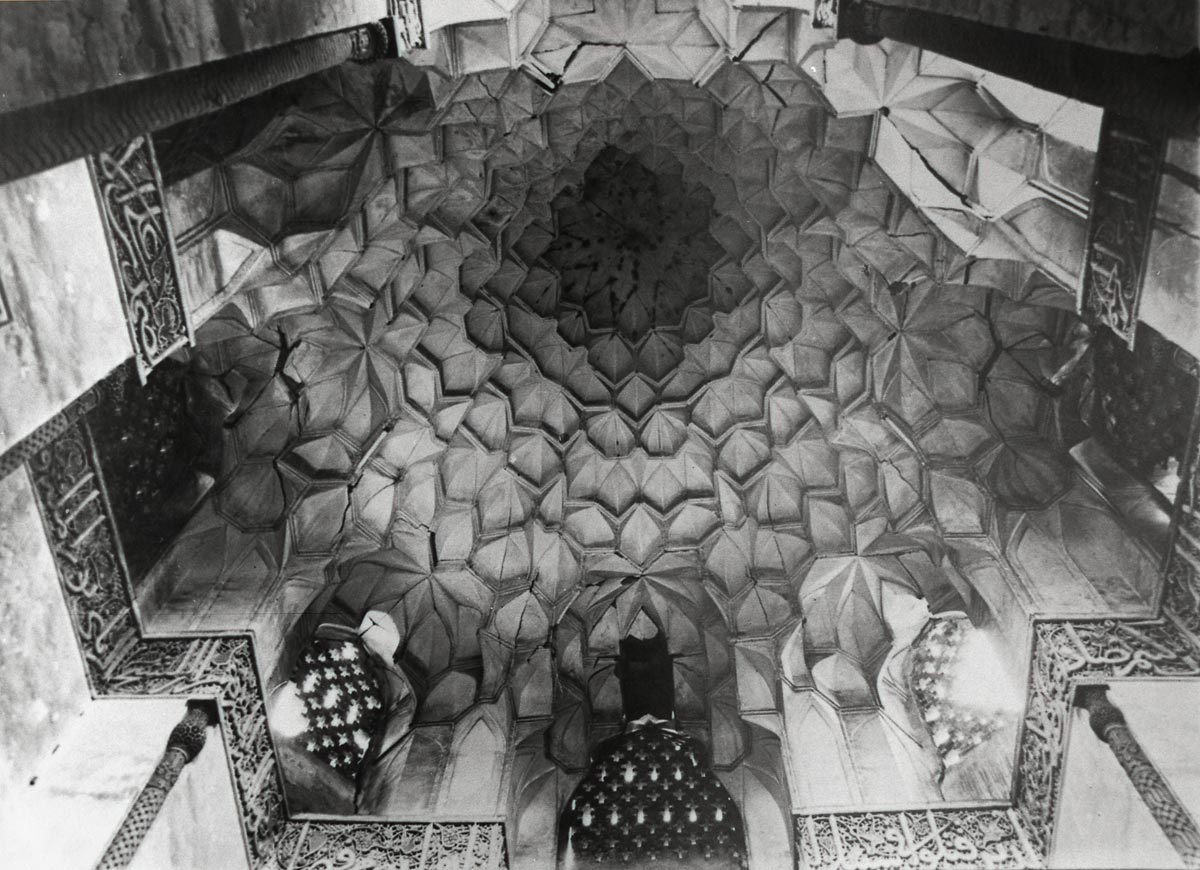 Muqarnas, sometimes referred to as stalactites, are pointed niches arranged in tiers that appear to form a honeycomb or staircase. They are a signature decorative element of Islamic architecture, in which they fulfill both functional and ornamental purposes. This architectural structure, which serves to transition from a square base to a circular dome, developed around the tenth century in Iran and Iraq, penetrating North Africa sometime during the eleventh century.5 Muqarnas also create optical illusions that add depth to an architectural space by playing with light cast onto the intersecting facets, as can be seen in the Shrine of Shaykh ‘Abd al-Samad in Natanz, Iran (Figure 1).6 This shrine was constructed during the early fourteenth century to mark the grave of a Sufi shaykh who died in 1299 CE. The muqarnas ceiling captured in Pope's photograph shows the rippling facets as they cascade down the interior of the shrine's conical dome.