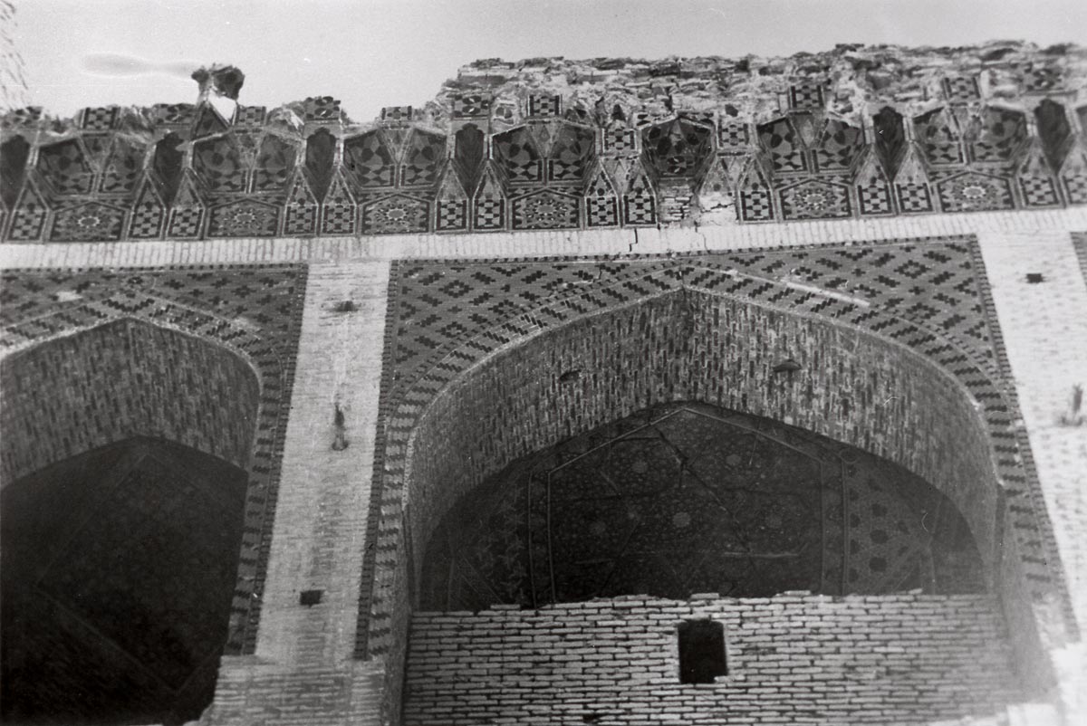 Muqarnas are used in domes, niches, arches, and friezes. Another early example of muqarnas is found in a horizontal decorative cornice that ornaments the Tomb of Sultan Öljeitü built in 1302-12 CE (Figure 2).7 In the photograph, the frieze displays one extant tier of tiled niches above the second-story archways that frame the arcade. This Ilkhanid mausoleum stands isolated in the ruins of the once flourishing city of Sultaniya. As its crowning glory, the tomb showcases architectural knowledge and practice in medieval Iran. On its exterior, the royal tomb was lavishly decorated with tile mosaic work.8 Cut-tile pieces were fitted to create a variety of floral and geometric patterns; these also were applied to the cornice of muqarnas as recorded in Pope's photograph and the fragment included in the exhibition.