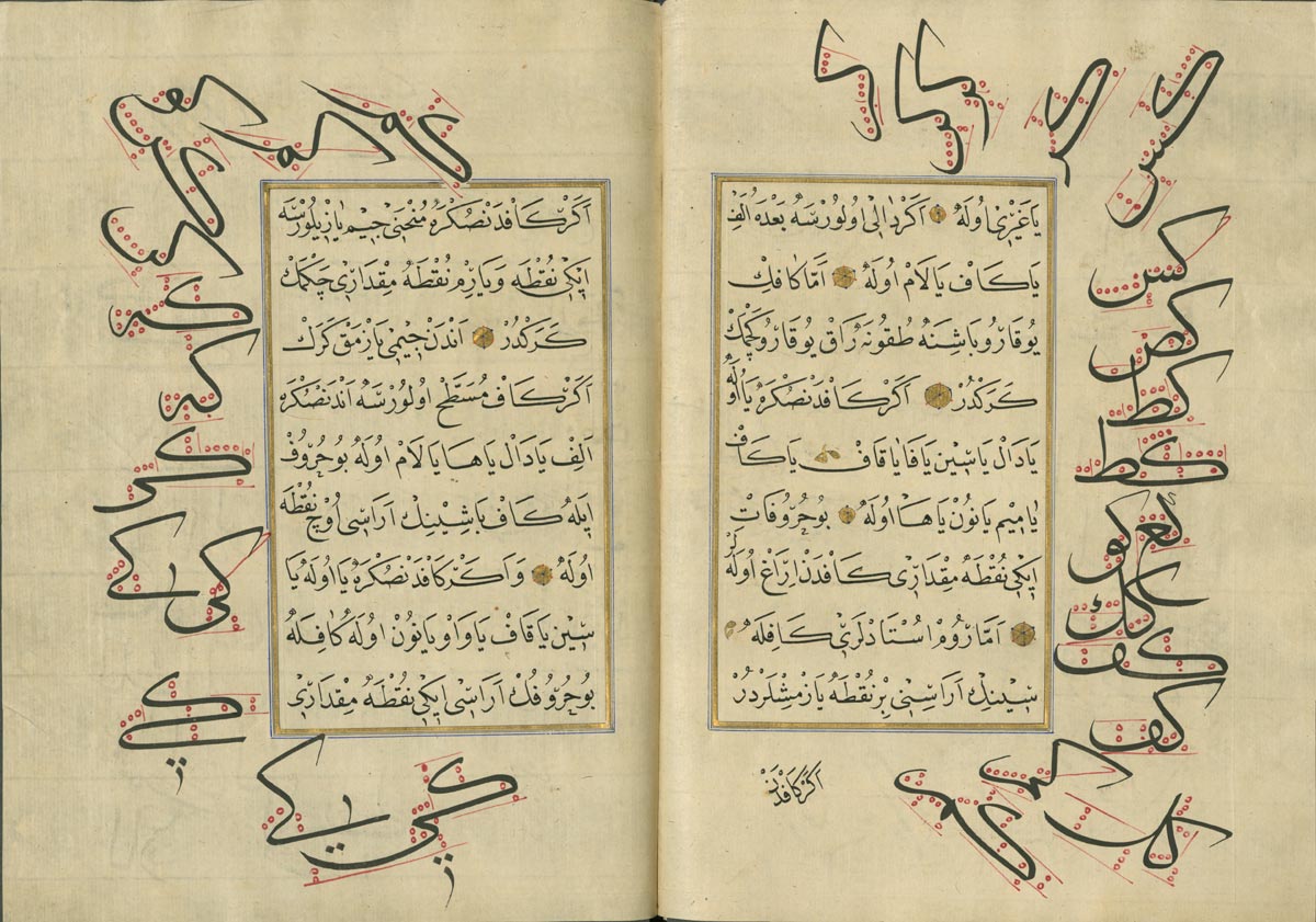 Calligraphy in the Arabic script is created using a system of proportions based on the rhomboid. This shape is formed when the ink-soaked tip of the reed pen is pressed onto a writing surface like paper. In this calligraphic treatise written in Ottoman Turkish, the scribe demonstrates the rhombic system in the margins, measuring each Arabic letter with rows of red circles.