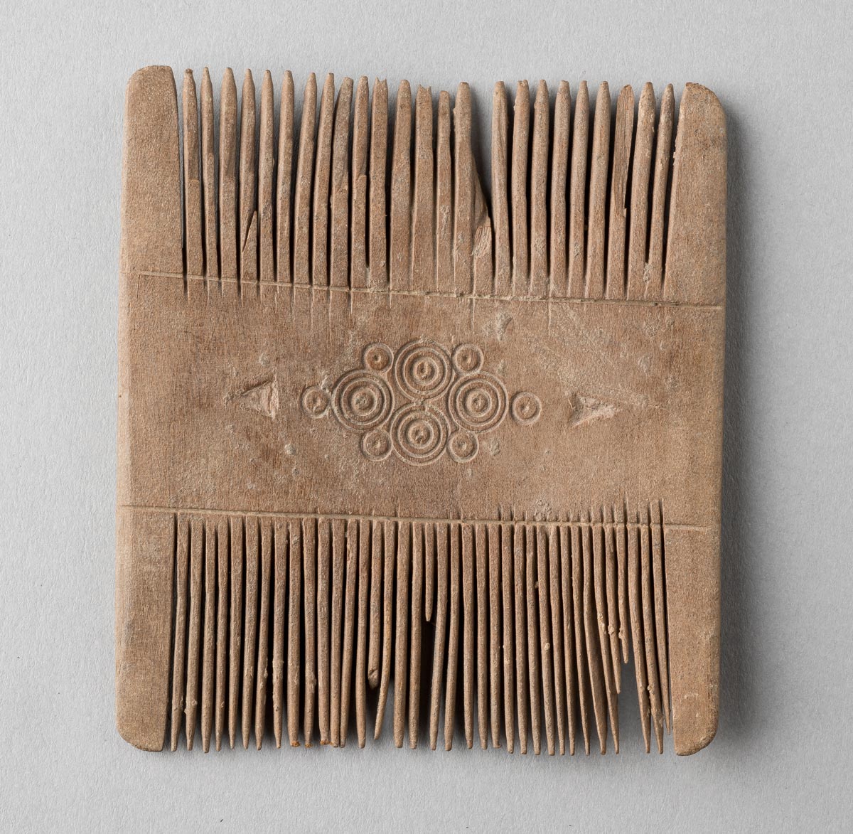 The wooden combs found in Fustat (medieval Cairo) were used in Egyptian everyday life. They detangled knots, and cleaned and styled hair. The different widths of denticulation allowed for the comb’s dual function. The broader teeth unkinked the hair, while the finer teeth rid it of lice as well as dust and dirt. Its uses were thus hygienic and aesthetic. In addition, functional objects such as these were quite often ornamented with patterns, including series of concentric circles like those delicately carved into the center panel of this wooden comb. Other combs also include inscriptions that praise solely their aesthetic results, proudly declaring: "I am a comb for the hair. I am only used for beauty."
