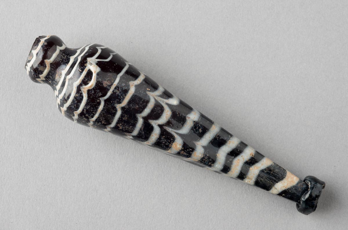 This spear-shaped flask is decorated with a wave pattern, which is created by marvering white threads of glass around a glass body of contrasting color. The threads are combed or pulled while still in a semi-liquid form. This color combination of blue-purple glass with white threads is typical of the technique of glass marvering, which was quite popular in the medieval period. This small flask would have been used to store cosmetic materials such as kohl powder or essential oils.