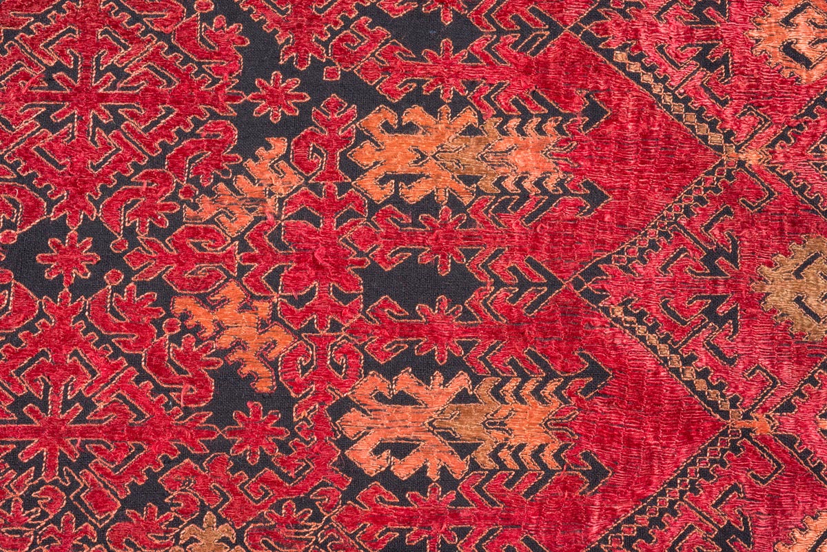 This modern embroidered textile, or suzani, is in immaculate condition. Its every inch is covered in expertly stitched embroidery. The dark indigo-black of the base cloth can hardly be seen beneath the dense embroidered patterns executed in a warm color palette of reds, oranges, and yellows, with occasional touches of pale green. The design is almost symmetrical across the width, and rows of arch-like motifs demarcate the textile's central point. The patterns of geometric motifs are worked largely on the diagonal. Such a large textile could have fulfilled a variety of functions as a wrapped garment or wall furnishing.