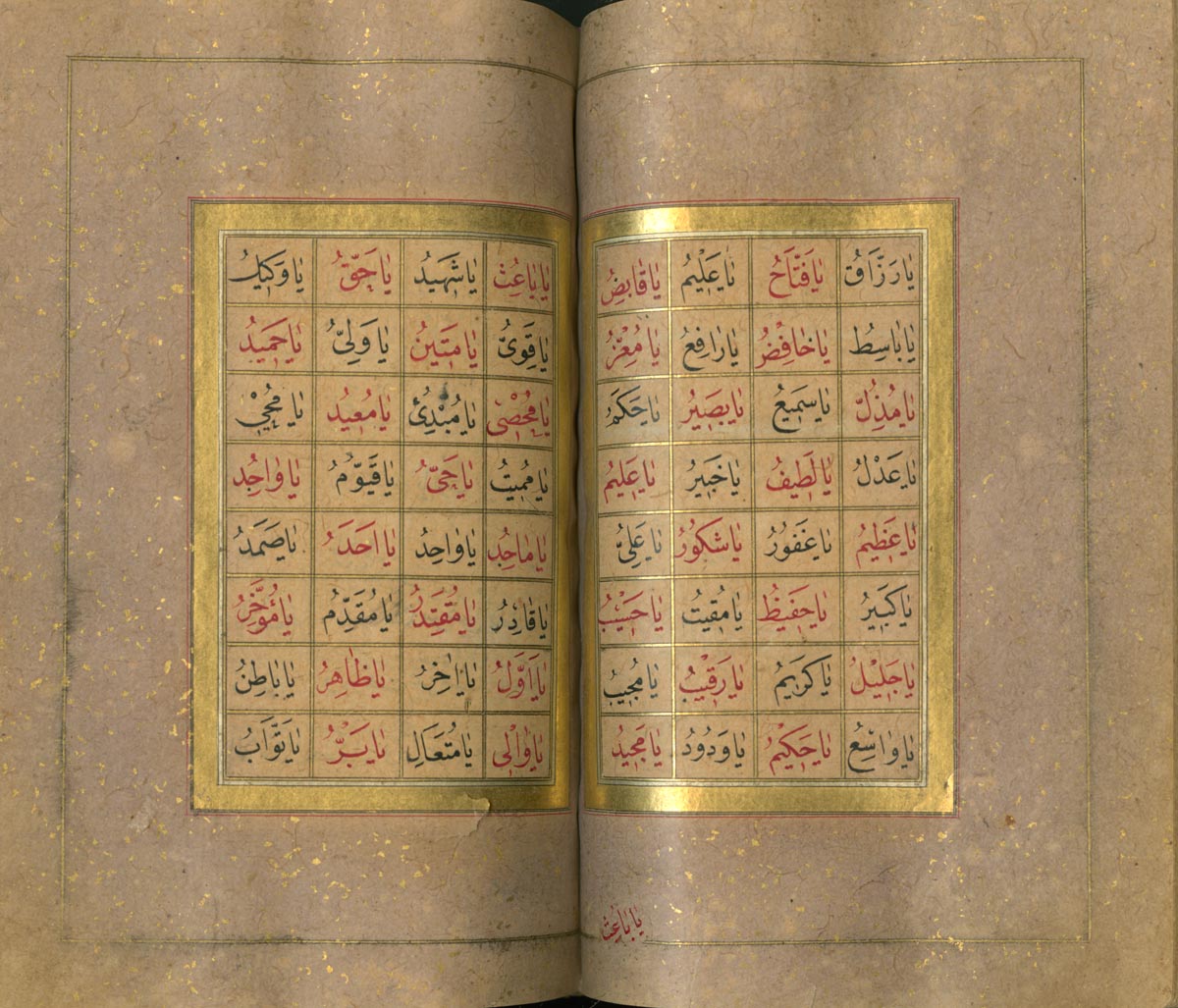 This collection of prayers includes a grid containing the ninety-nine "Beautiful Names" of God (al-asma’ al-husna). The text area is bordered by a thick gold frame, situated within a lavender-dyed and gold-flecked page. The names of God are written in the vocative and transcribed in alternating colors of red and black ink within separate cells. The "Beautiful Names" of God comprise his many attributes and epithets, including al-Rahman (The Compassionate) and al-Rahim (The Merciful). As part of prayer practices, devotees recite these names, often with the aid of a string of thirty-three prayer beads.