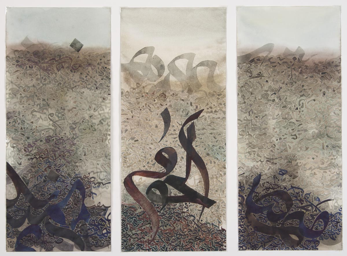 Syrian-born contemporary artist Khaled al-Saa’i creates delicate calligraphic paintings composed of Arabic letters. While some letters are discernable within the composition, Resurrection explores the formal potential and dynamic movement of letter shapes. Entangled in an ethereal mist, large calligraphic forms hover in mid-air, rising as if from a mound of debris below. At the top of the left panel a single rhombic dot marks a fading horizon. In Islamic traditions, the rhombus is considered the genesis of all Arabic letters. Classical calligraphers were trained to use the rhomboid to measure the strokes of their letterforms. Like strung pearls, chains of rhomboids calculate the proper proportions of each letter. In this calligraphic triptych, al-Saa’i builds upon older Islamic calligraphic traditions to further explore the rhombus as a creative force as his letters emerge from the brown earth and "resurrect" into new spiritual forms.