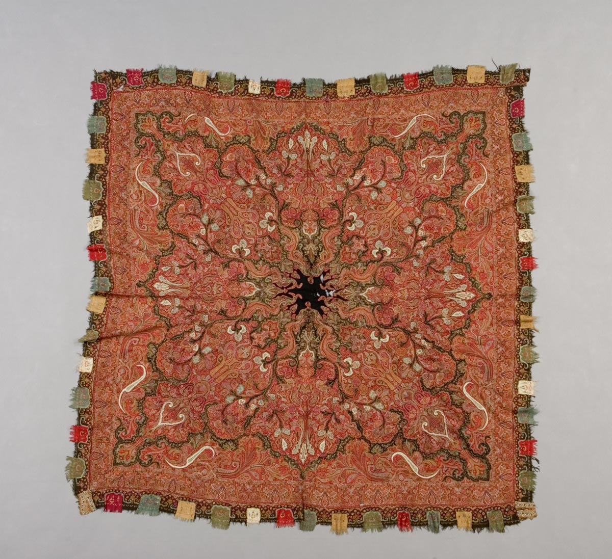 Large shawls like this one were worn on the body, strategically draped to show the fine artistry of the design and craftsmanship of the construction. This square shawl in particular was made from many small pieces of woven cloth masterfully stitched together in the so-called patchwork technique. It exhibits at least a dozen colors of dyed wool woven from the down of the Cashmere goat, a fine fiber still coveted today. While popular in Kashmir during the late 19th century, such luxurious shawls also became highly fashionable garments in Europe, where they sparked a new shawl-weaving industry that was aided significantly by the advent of the automatized Jacquard loom.