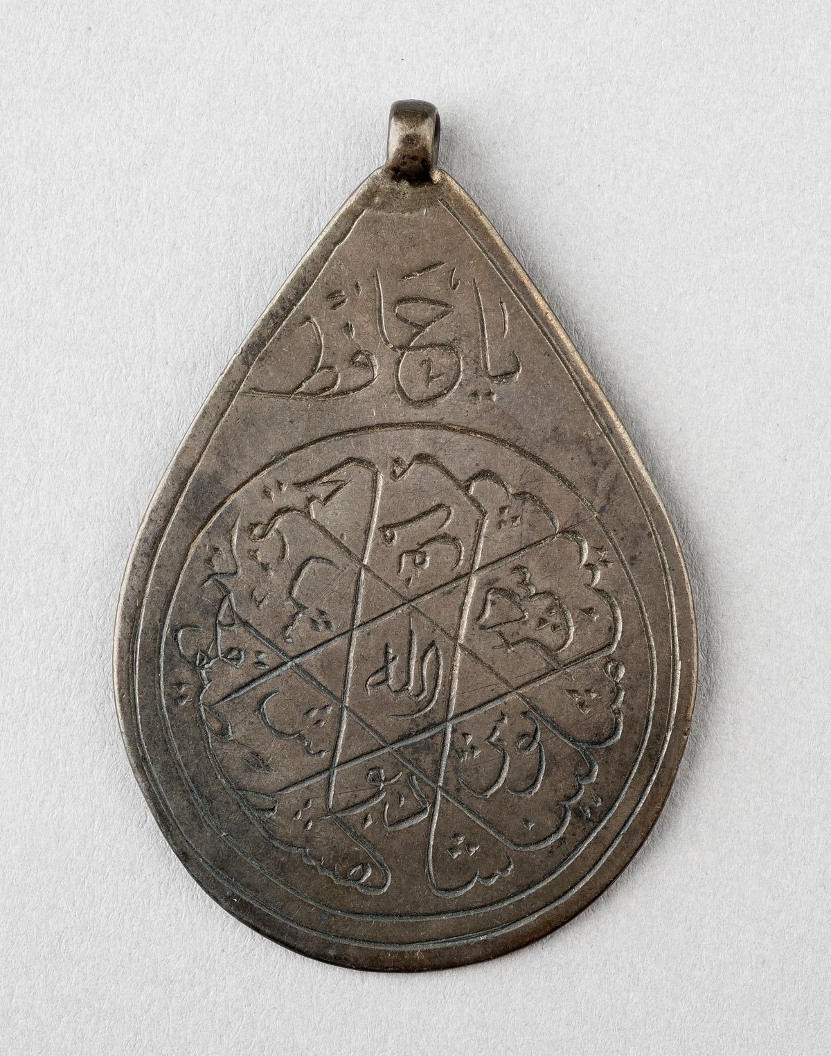 This tear-shaped lead amulet is clearly a pendant meant to be worn. It includes inscriptions on its front and back, which are intended to physically and spiritually protect the wearer. At the top of the amulet's front side appears the phrase "Ya Hafiz," which invokes God as the "Protector" (Hafiz). Below, a circle of intersecting words (forming a six-pointed star) provides the names of the Seven Sleepers of Ephesus, ancient legendary figures who are said to have slept for hundreds of years. The Sleepers are mentioned in the Qur’an (18:9–26), and in later centuries it was believed that inscribing and reciting their names could protect an individual from harm. On the amulet's back side, a five-by-five grid comprises a magic square, or murabba‘. Within this checkerboard design are inscribed pairs of letters that are slight permutations of the so-called mysterious letters initiating some chapters in the Qur’an (here, chapters 19 and 42). Encircling the magic square are the names of the four protective archangels: Gabriel, Michael, Israfil, and ‘Azra’il.