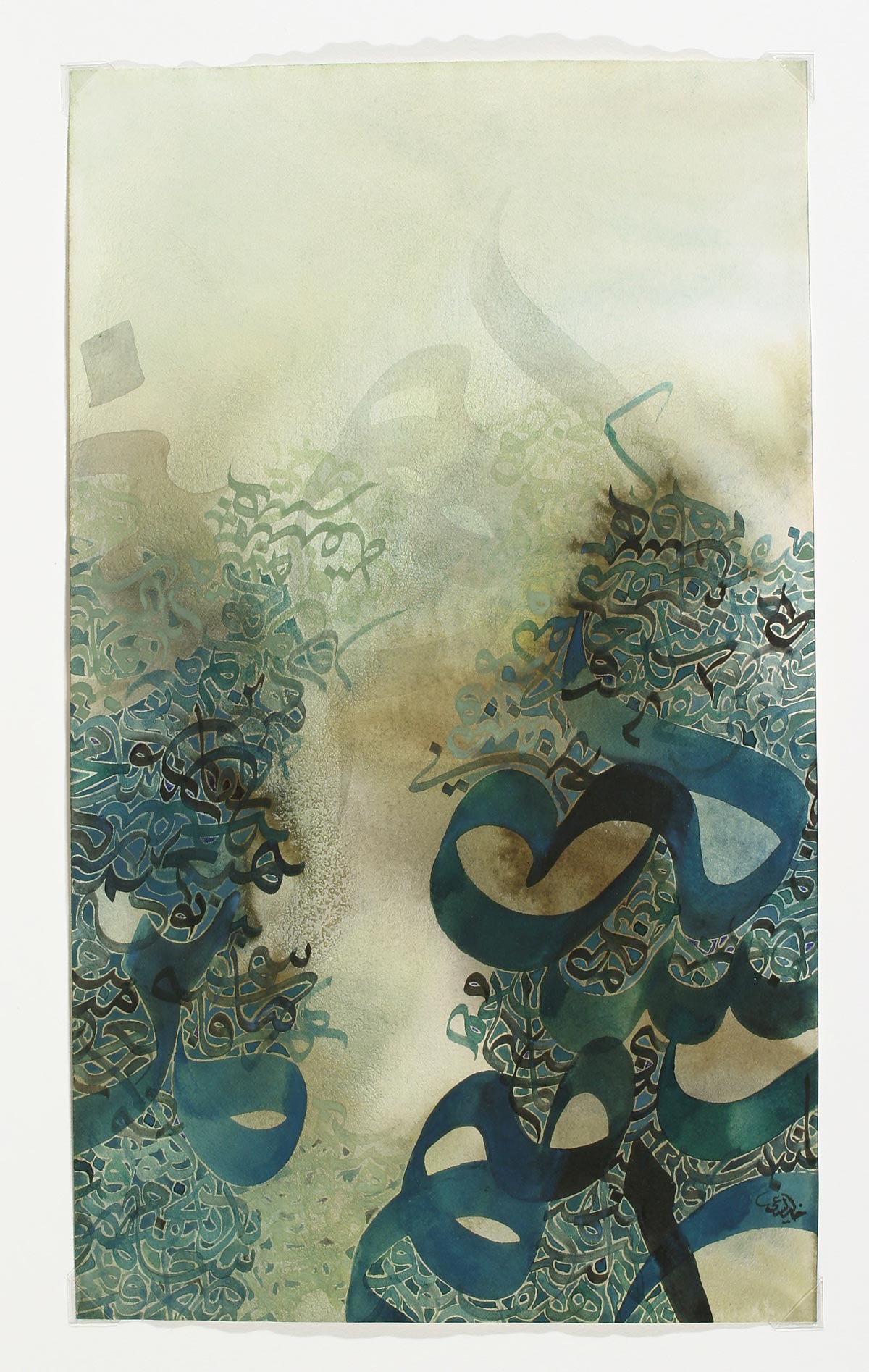 In this painting, Syrian-born contemporary calligraphic artist Khaled al-Saa’i constructs an ethereal composition by layering and juxtaposing Arabic letterforms in varying sizes. He plays with space and light while also deconstructing words into letters and rhomboids. The painter transcends legibility and instead focuses on the form of the letters and the oral effects they generate. For example, the repeated soft letter ha produces the sound of sighing or exhaling. Suggestive of breathing through mist, the ha is appropriate for this painting, which al-Saa’i made during his 2002 stay in Ann Arbor. Through letterforms, their oral effects, and crisp hues, he attempts to convey his memorable experience of a chilly and snowy—yet soothing and picturesque—Michigan winter.